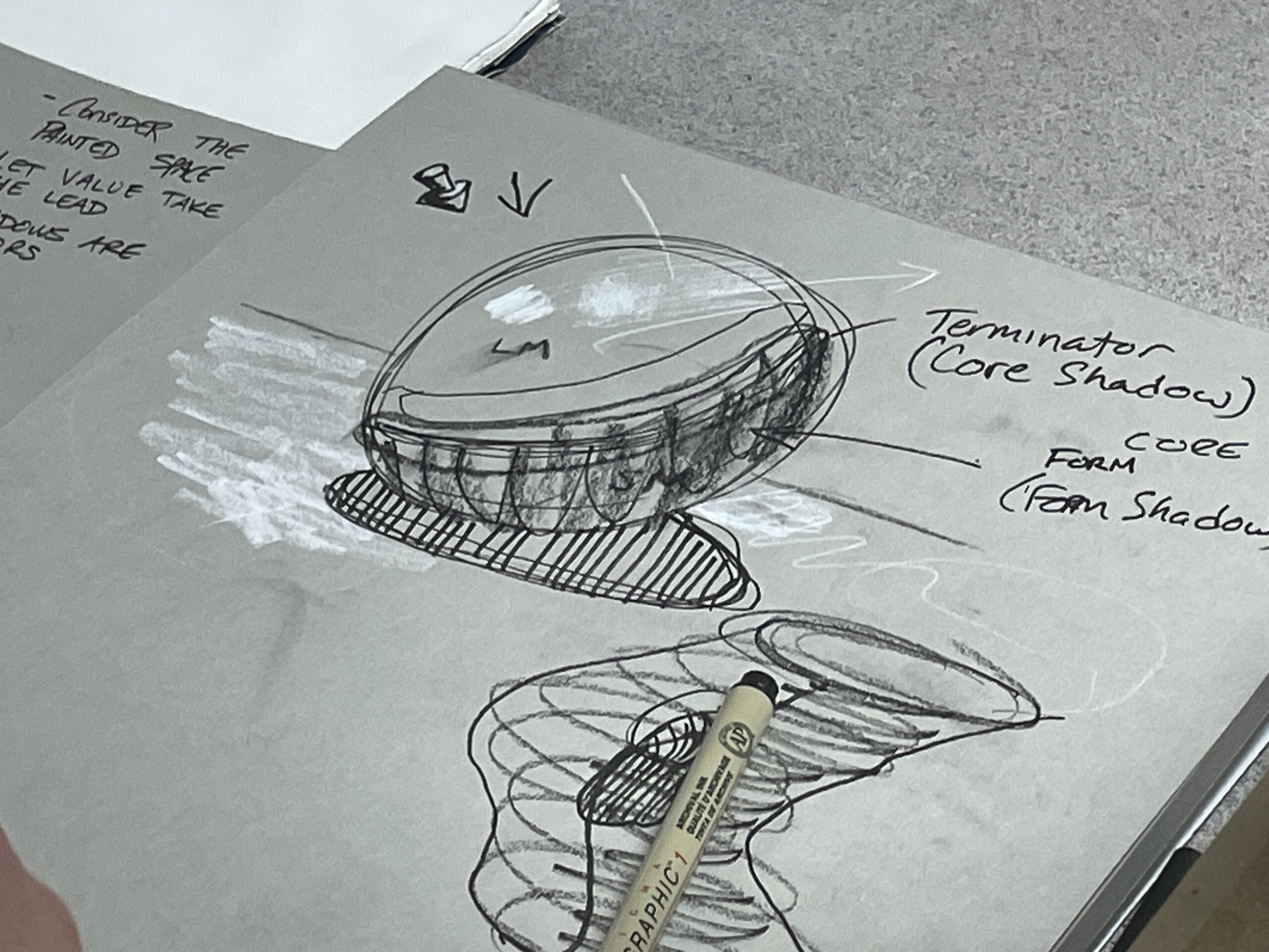 Using a small Father’s Day gift from his children, Trevor did a quick painting of it using just the fundamentals of painting shadows. He explained that values have relationships and grey is a tone, not a color.