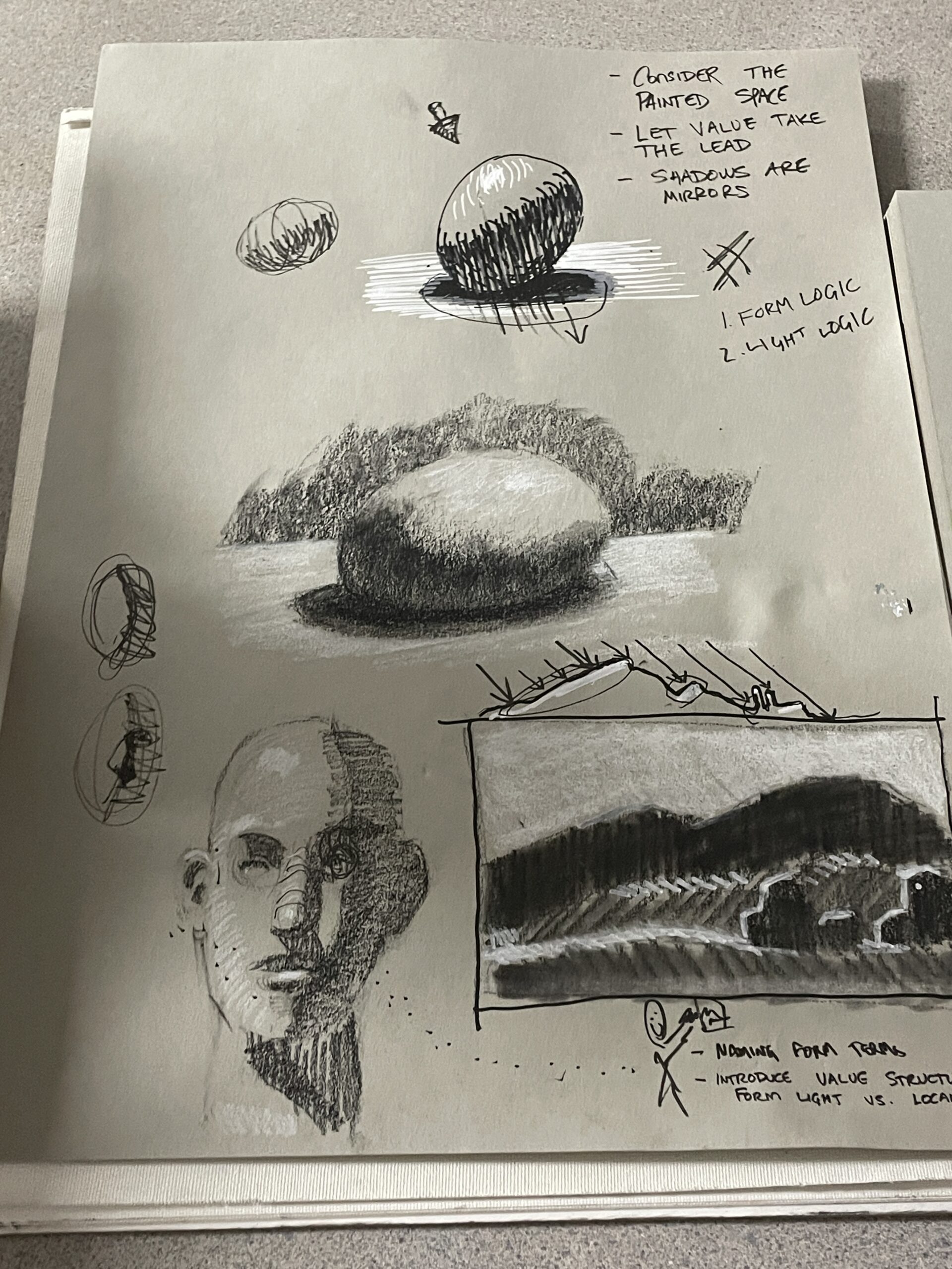 3. The Form Shadow. This is the area opposite the light mass, and will often have reflected light or colors of nearby things in it.