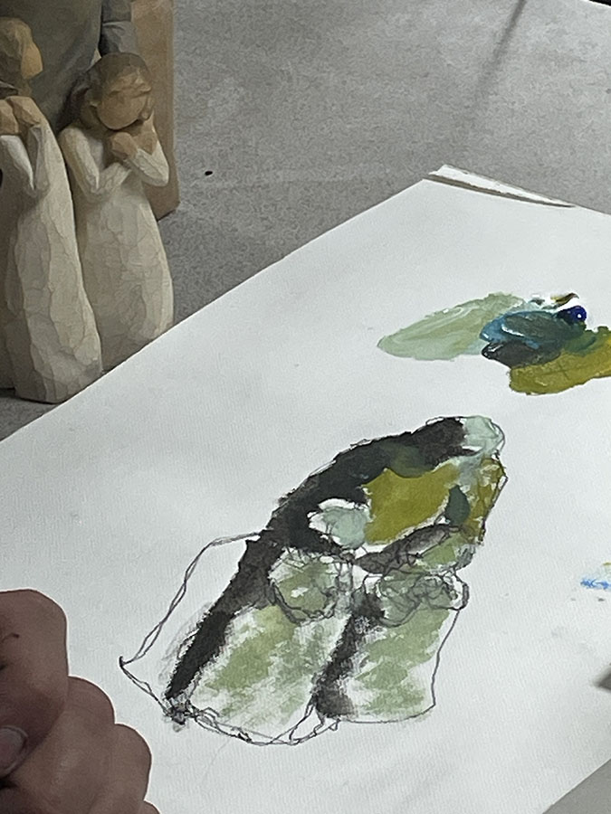 By looking at his gift, he painted the values first, then added color, and bounced light in the shadows. He also mixed warmer colors to add to the highlights and cooler colors in the shadow mass. He said to always keep in mind the color of the light.